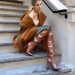На пике популярности шуба в бежевом цвете до середины бедра, которую можно красиво скомбинировать с сапогами-чулками и юбкой миди длины.