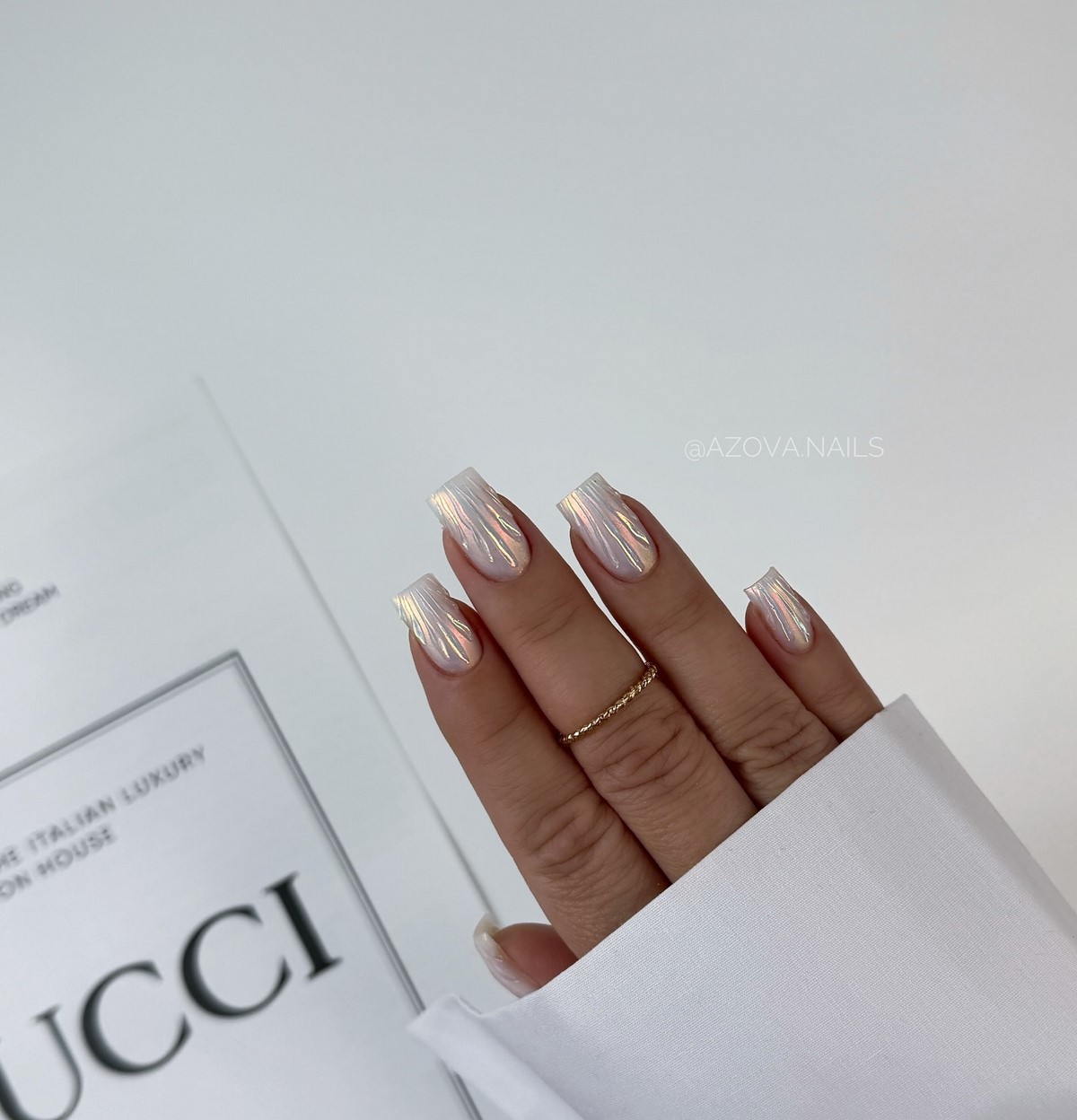 Зеркальная втирка — возвращение к эффектному минимализму. Хром, жемчуг, платина и молочный глянец создают будущее настроение, идеально подходящее к трендам 2026 года. Особенно эффектно смотрится на миндалевидной форме ногтей. Такой дизайн гармонирует и с вечерним платьем, и с повседневным костюмом.