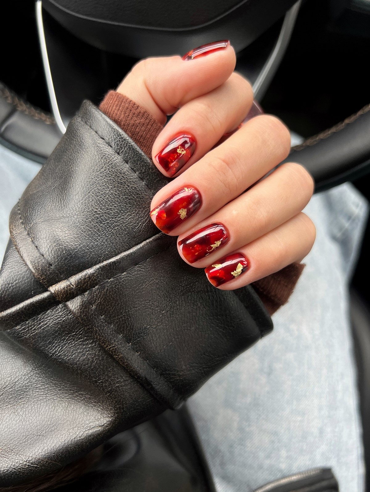 Красный — вечная классика Нового года. В сезоне 2026 он приобретает множество граней: от бордо и вишни до огненно-красного с металлическим финишем. Этот оттенок символизирует страсть, уверенность и праздник. Можно добавить акцент — золотую линию или один ноготь со стразами — для завершённого образа.