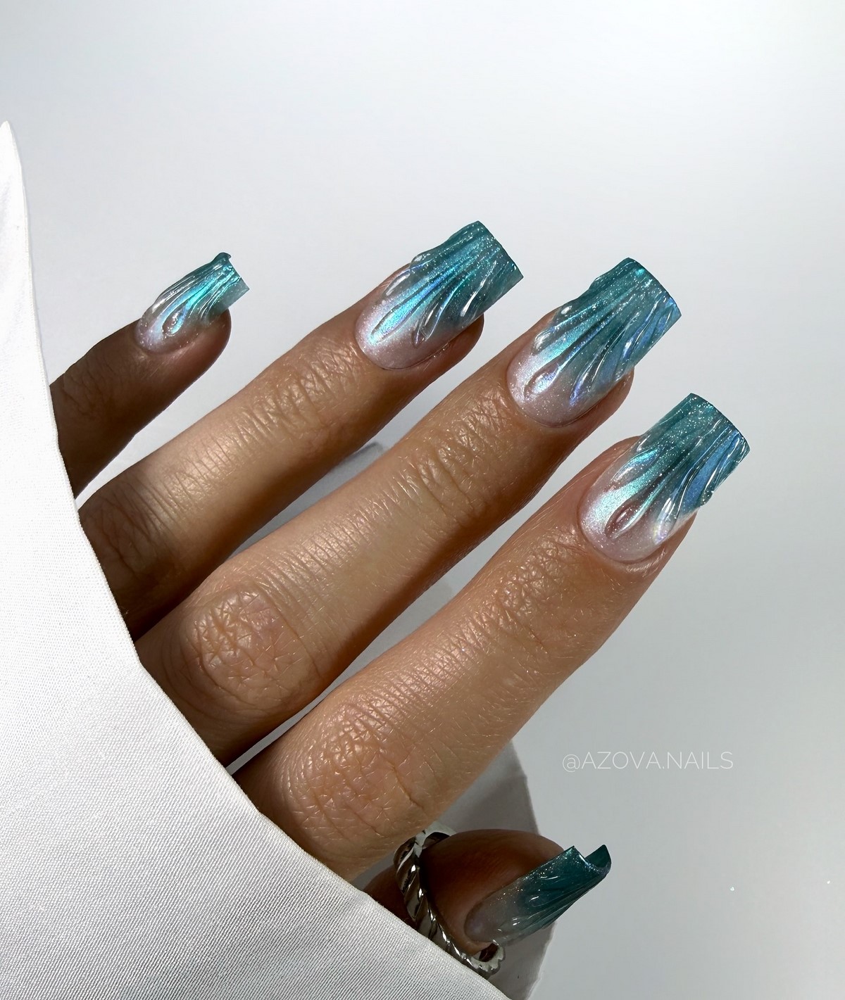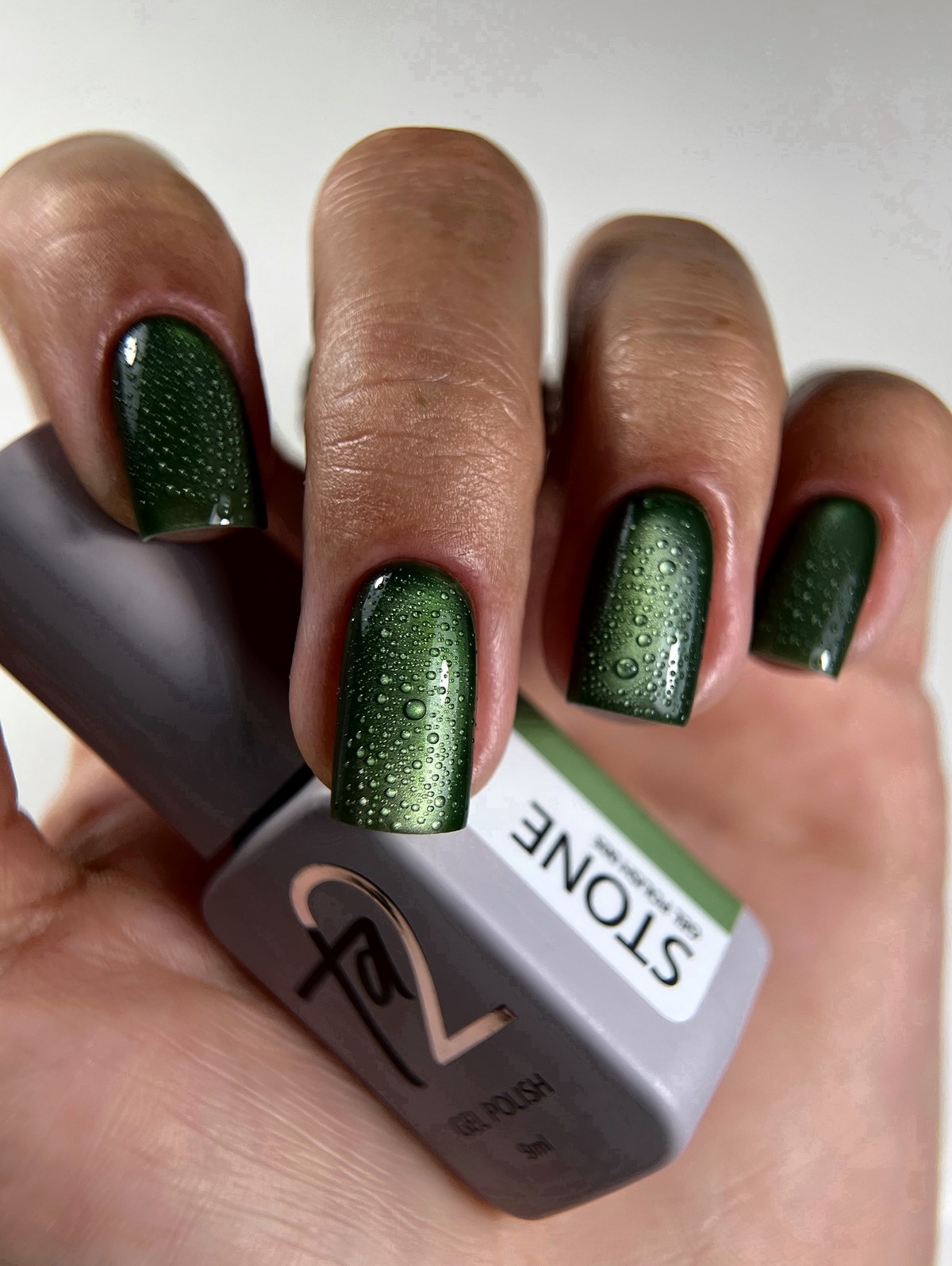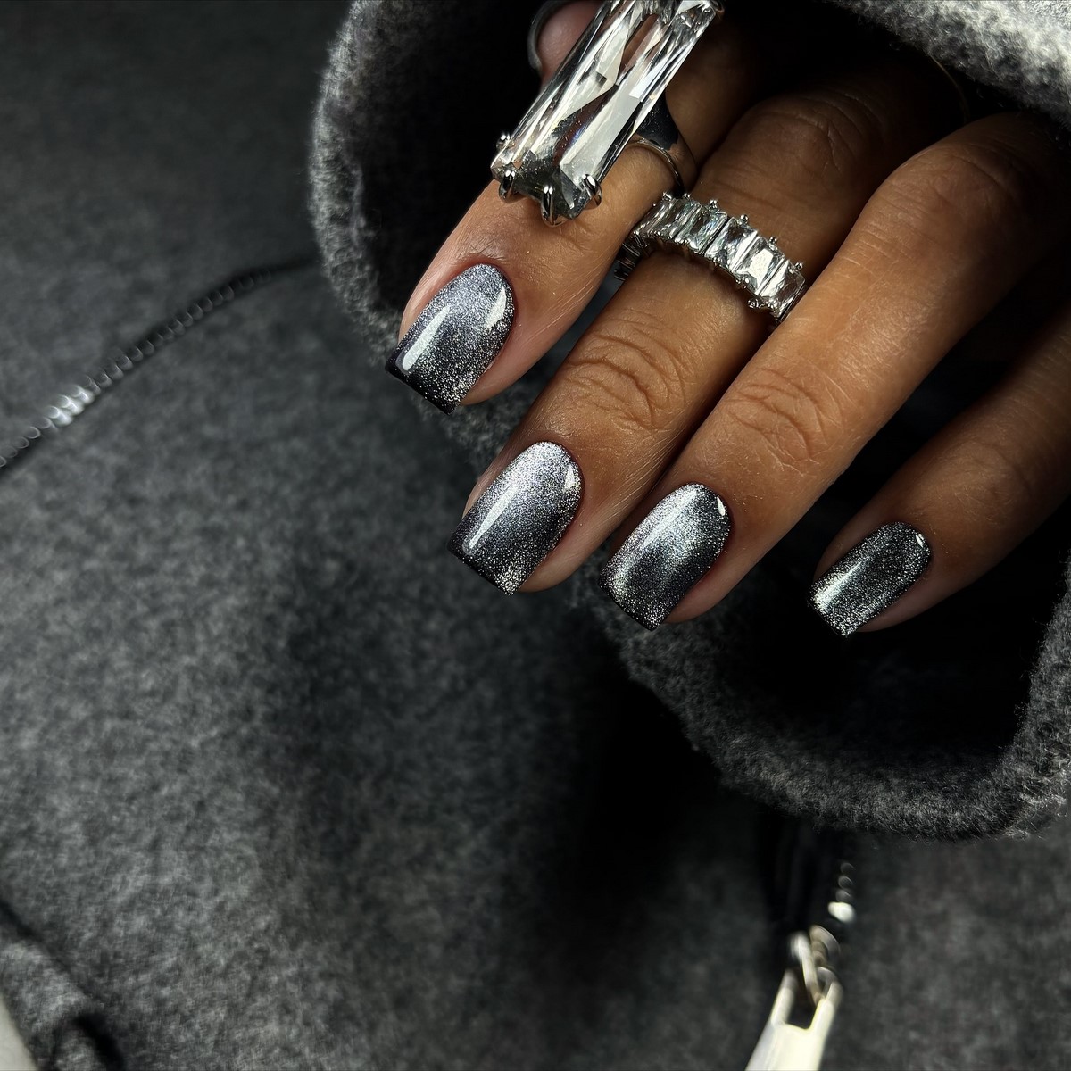 Эффект «кошачьего глаза» остаётся фаворитом. Его мягкие переливы придают глубину и таинственность, напоминая северное сияние. В 2026 году в моде холодные оттенки — изумруд, сапфир, фиолет и серебристый серый. Такой маникюр подходит для коротких и средних ногтей, добавляя им визуальный объём и сияние.