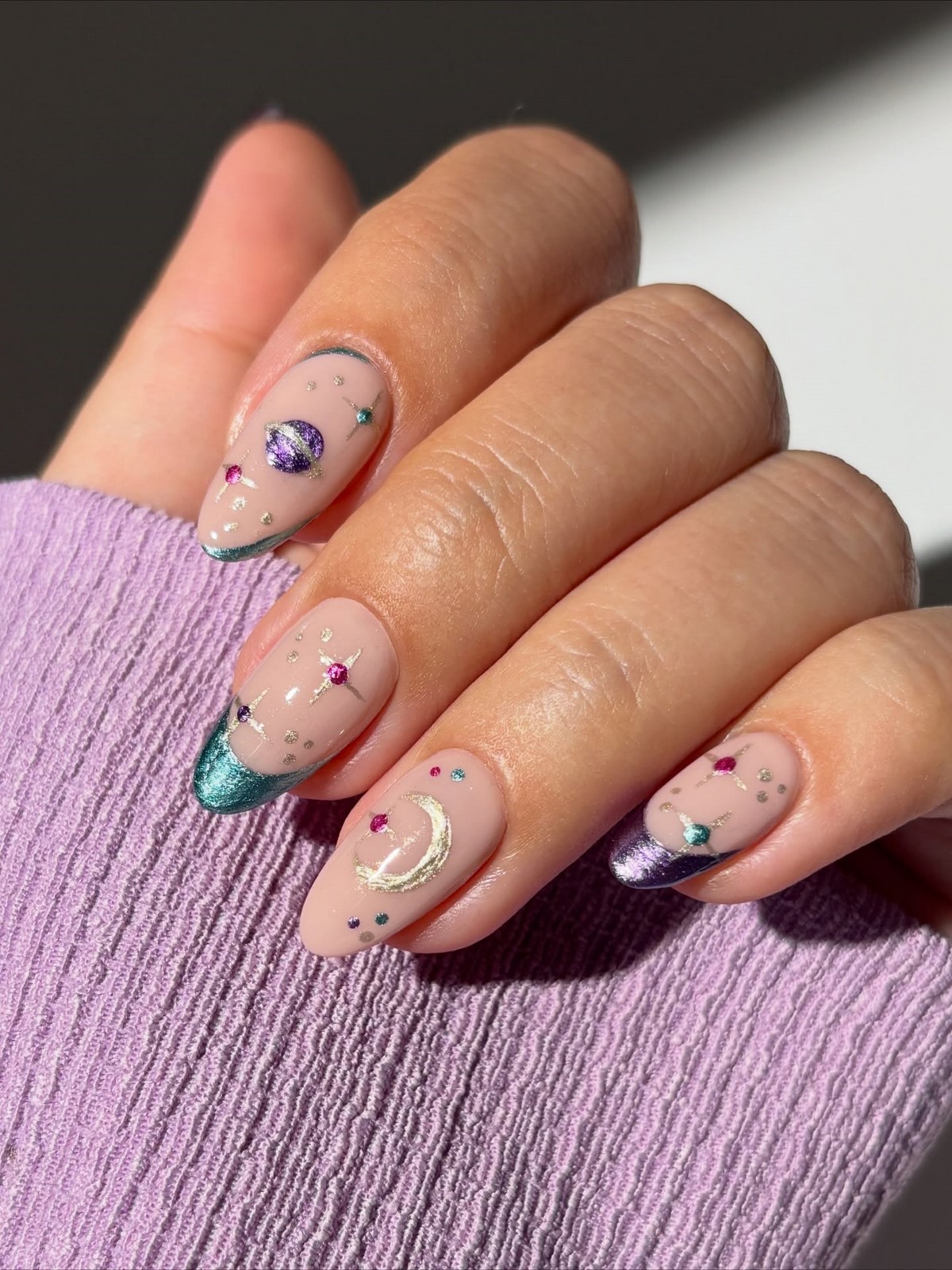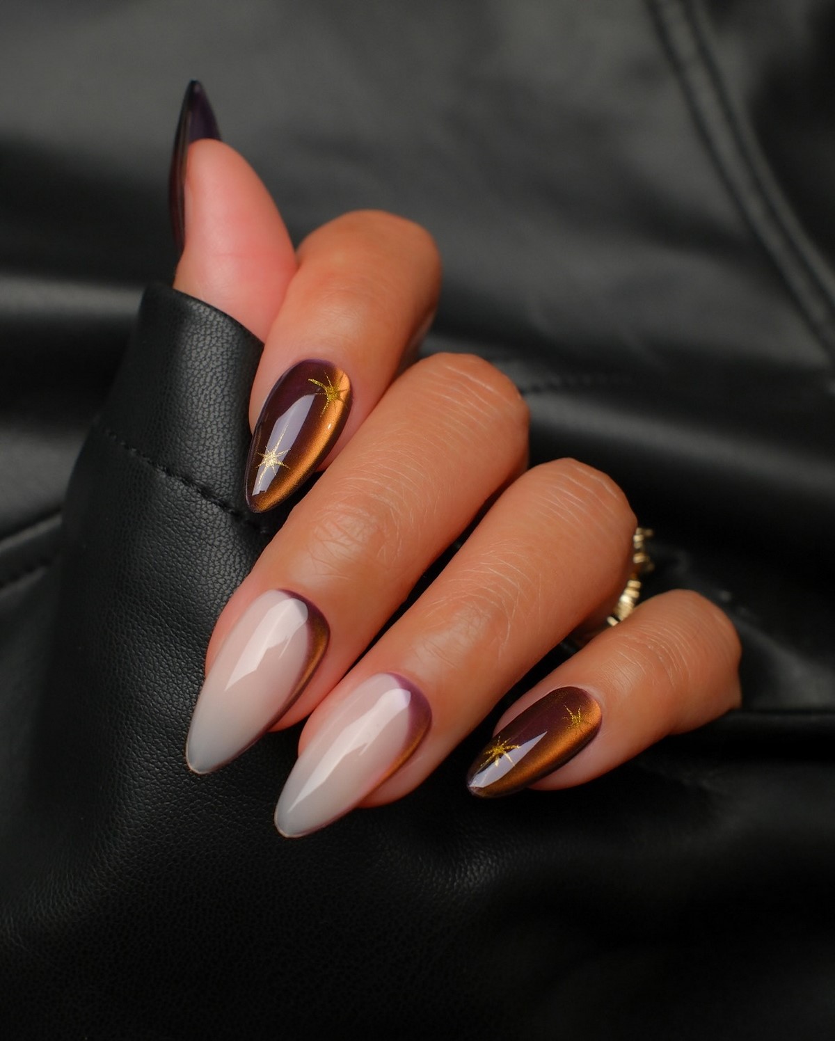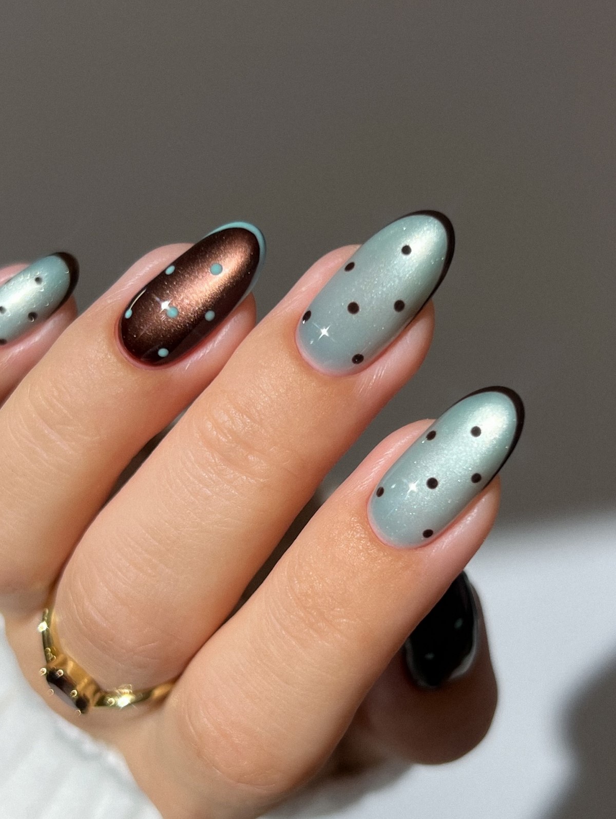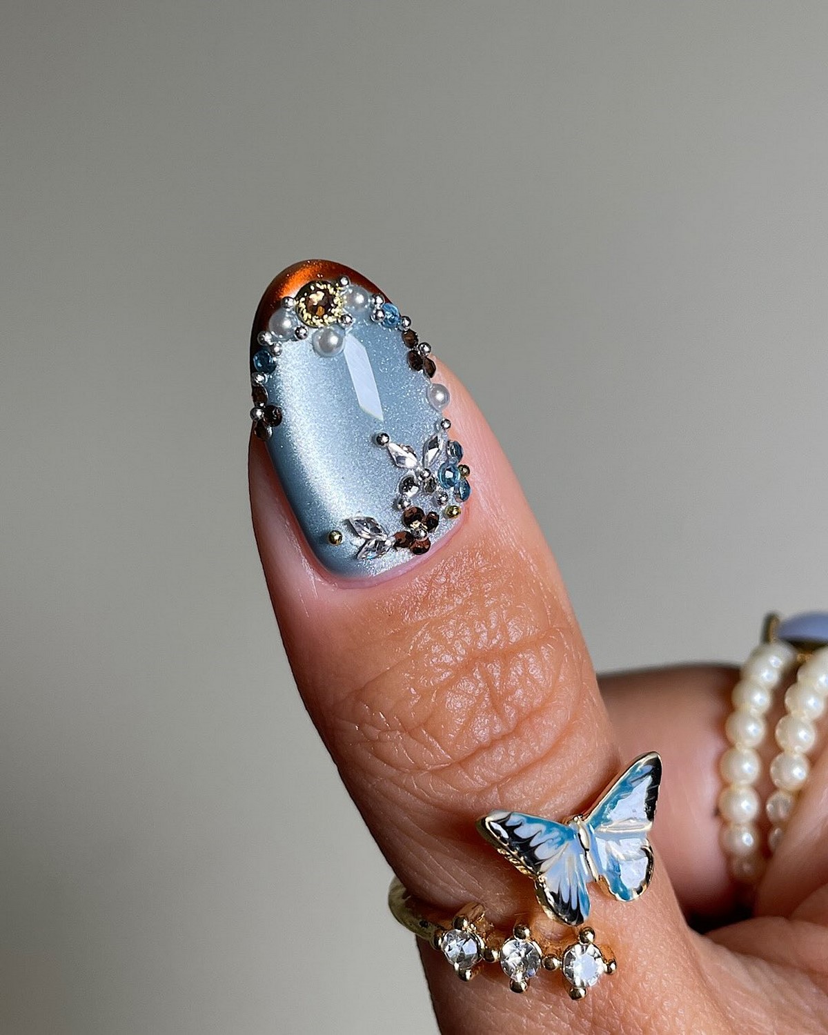 Эффект «кошачьего глаза» остаётся фаворитом. Его мягкие переливы придают глубину и таинственность, напоминая северное сияние. В 2026 году в моде холодные оттенки — изумруд, сапфир, фиолет и серебристый серый. Такой маникюр подходит для коротких и средних ногтей, добавляя им визуальный объём и сияние.
