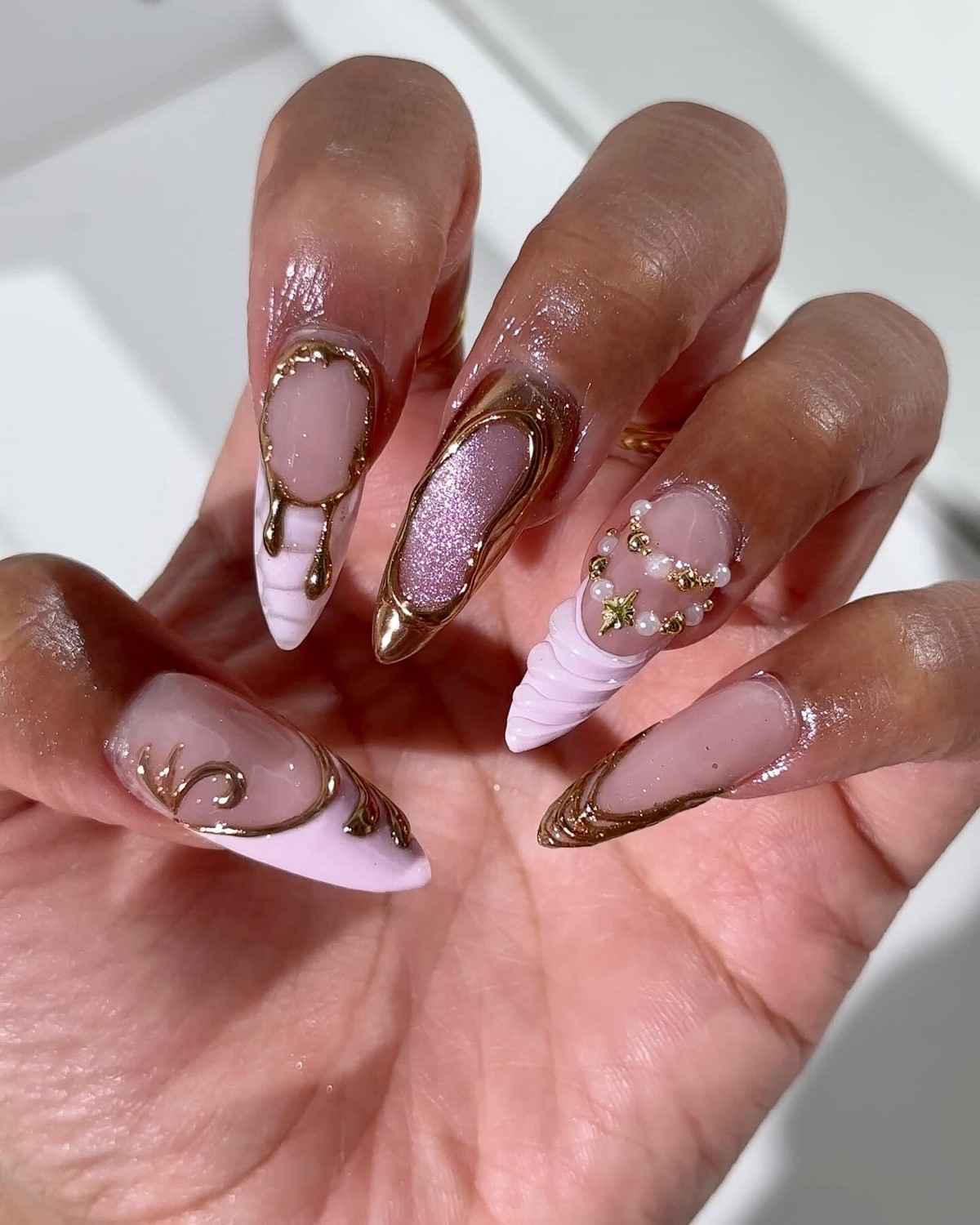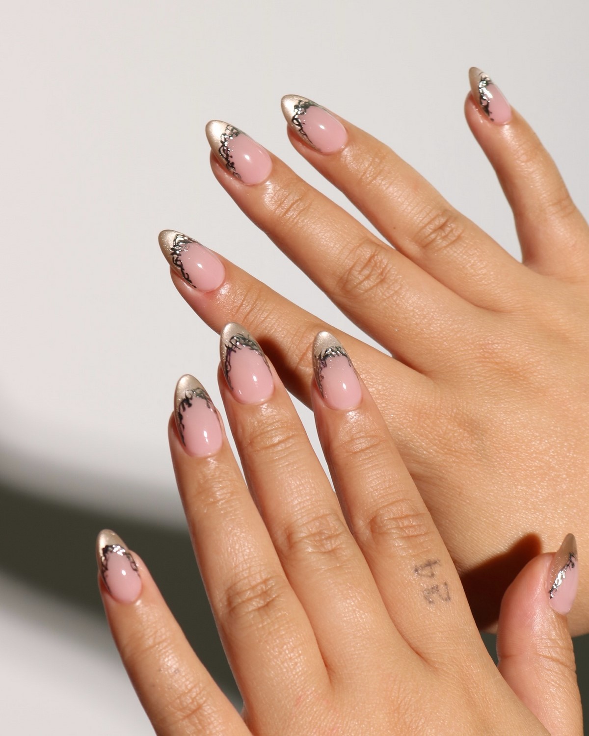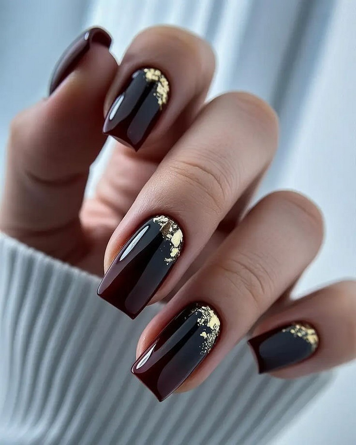 Тонкие фрагменты потали — золота или серебра — придают маникюру благородный акцент. Этот тренд ассоциируется с роскошью, но при этом выглядит утончённо. Поталь можно добавить на прозрачную базу или поверх цветного покрытия — идеальный вариант для торжественного вечера или фотосессии.