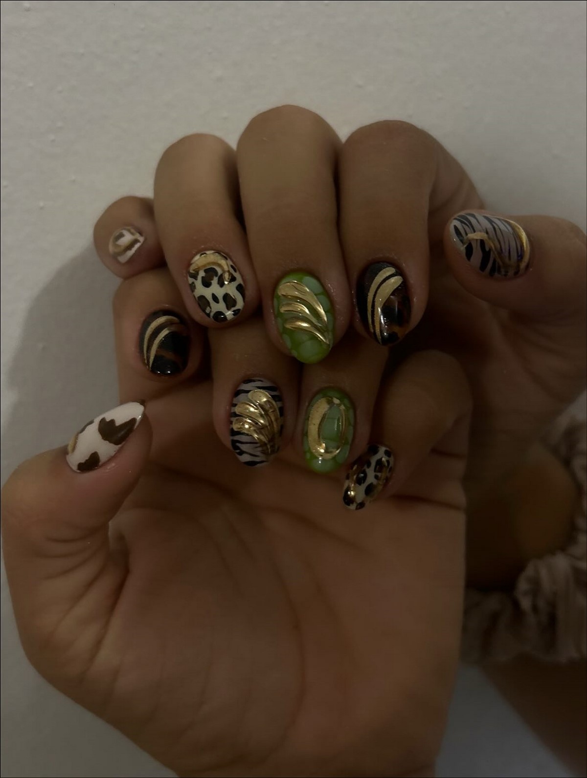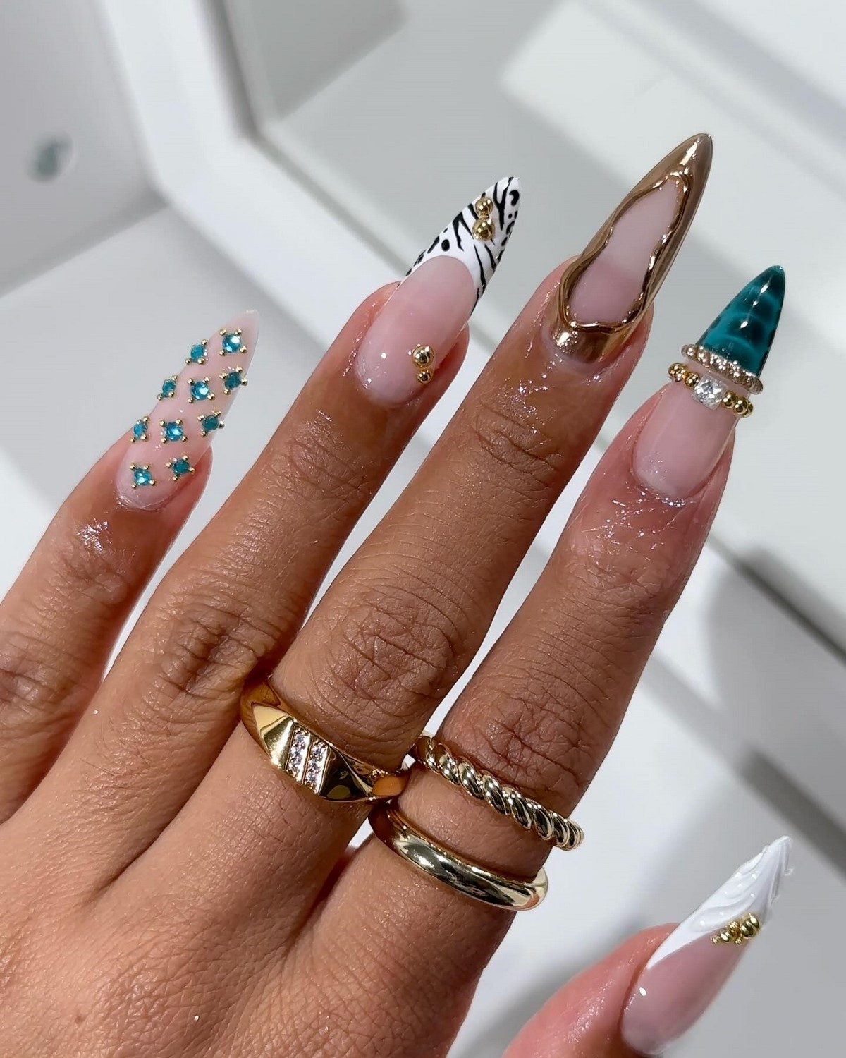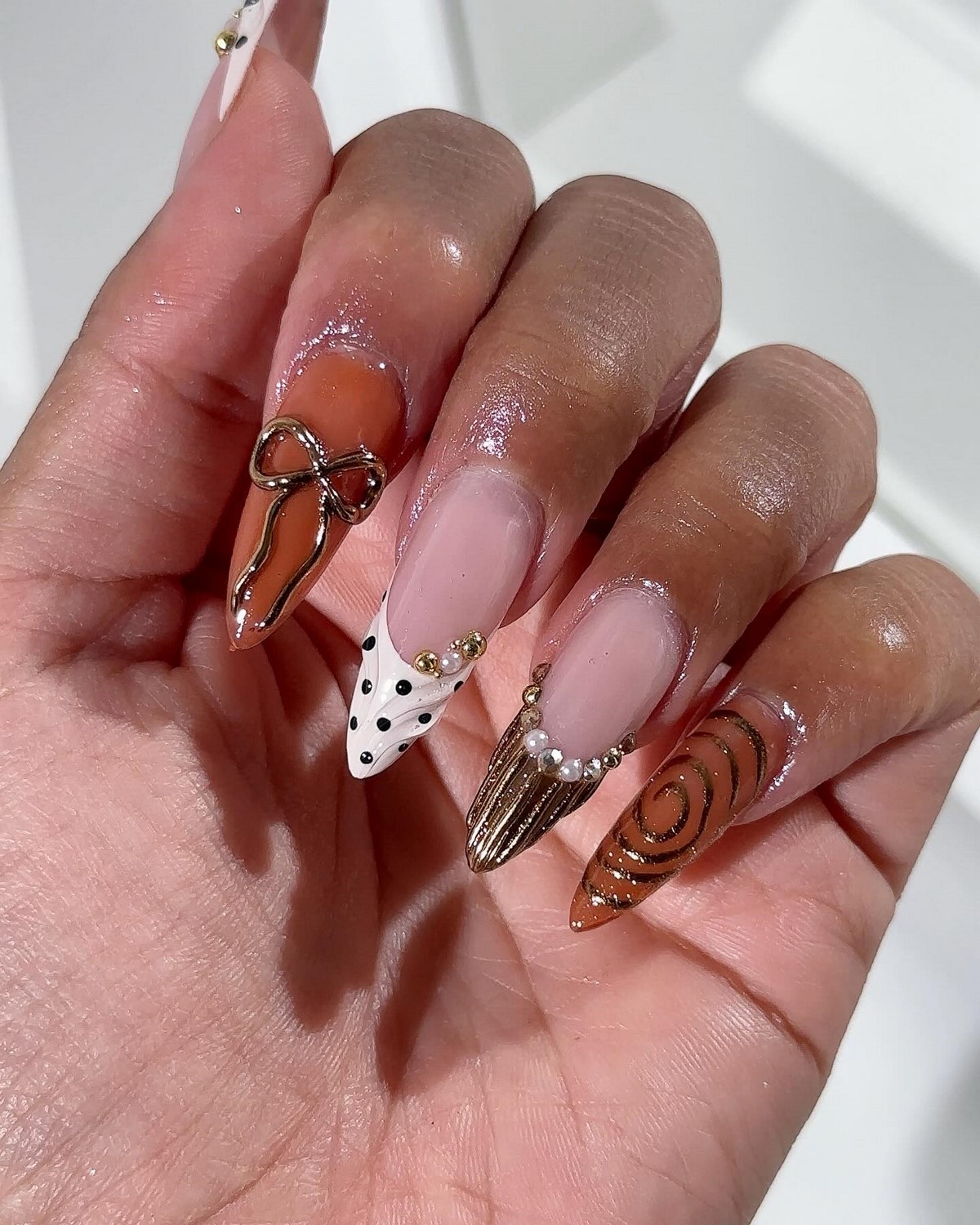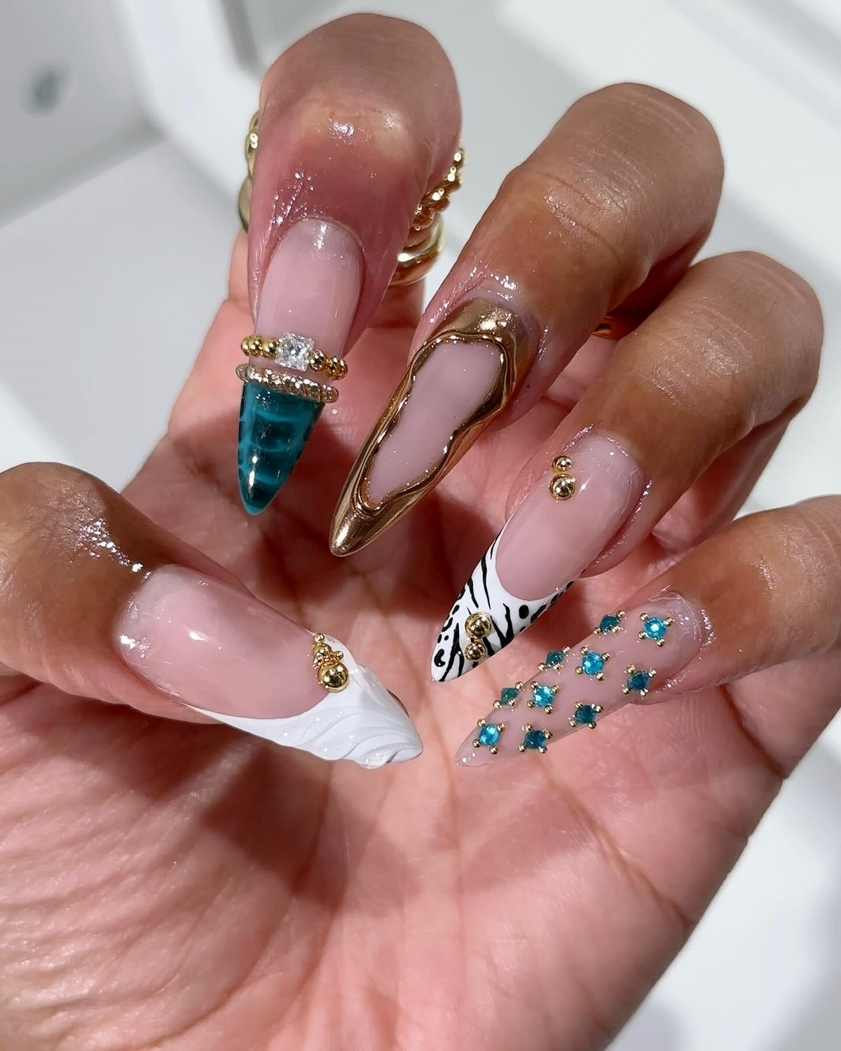 Тонкие фрагменты потали — золота или серебра — придают маникюру благородный акцент. Этот тренд ассоциируется с роскошью, но при этом выглядит утончённо. Поталь можно добавить на прозрачную базу или поверх цветного покрытия — идеальный вариант для торжественного вечера или фотосессии.