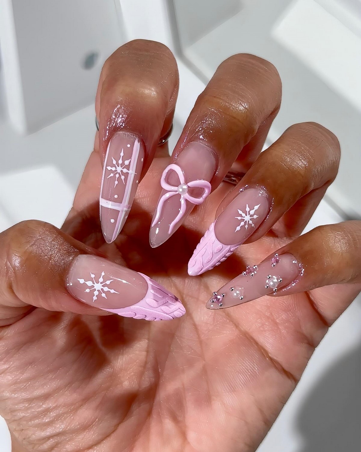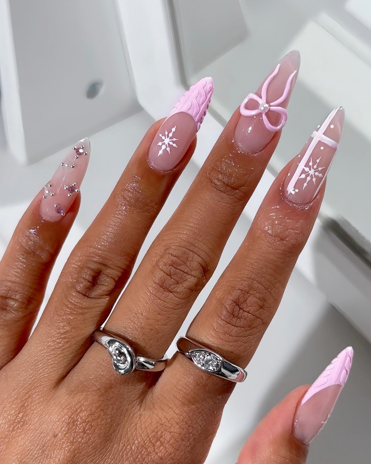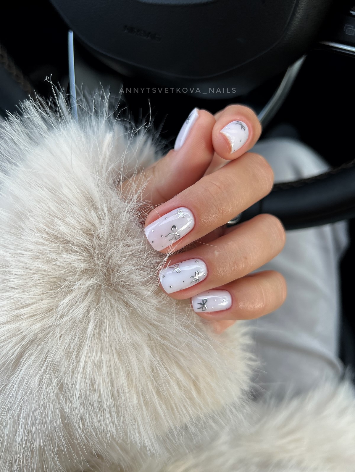 Миниатюрные банты на ногтях — главный милый тренд зимы 2025–2026. Они могут быть выполнены из страз, геля или 3D-декора. Такой акцент подчёркивает женственность и лёгкость образа, особенно если использовать пастельные или нежно-розовые тона. Это выбор для тех, кто любит романтику и моду с характером.
