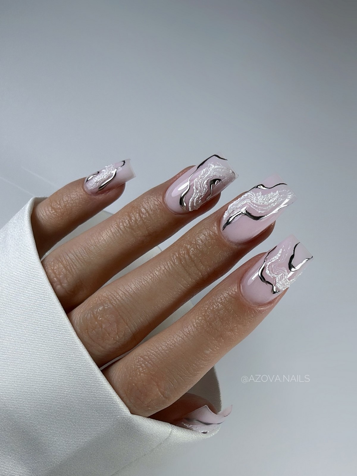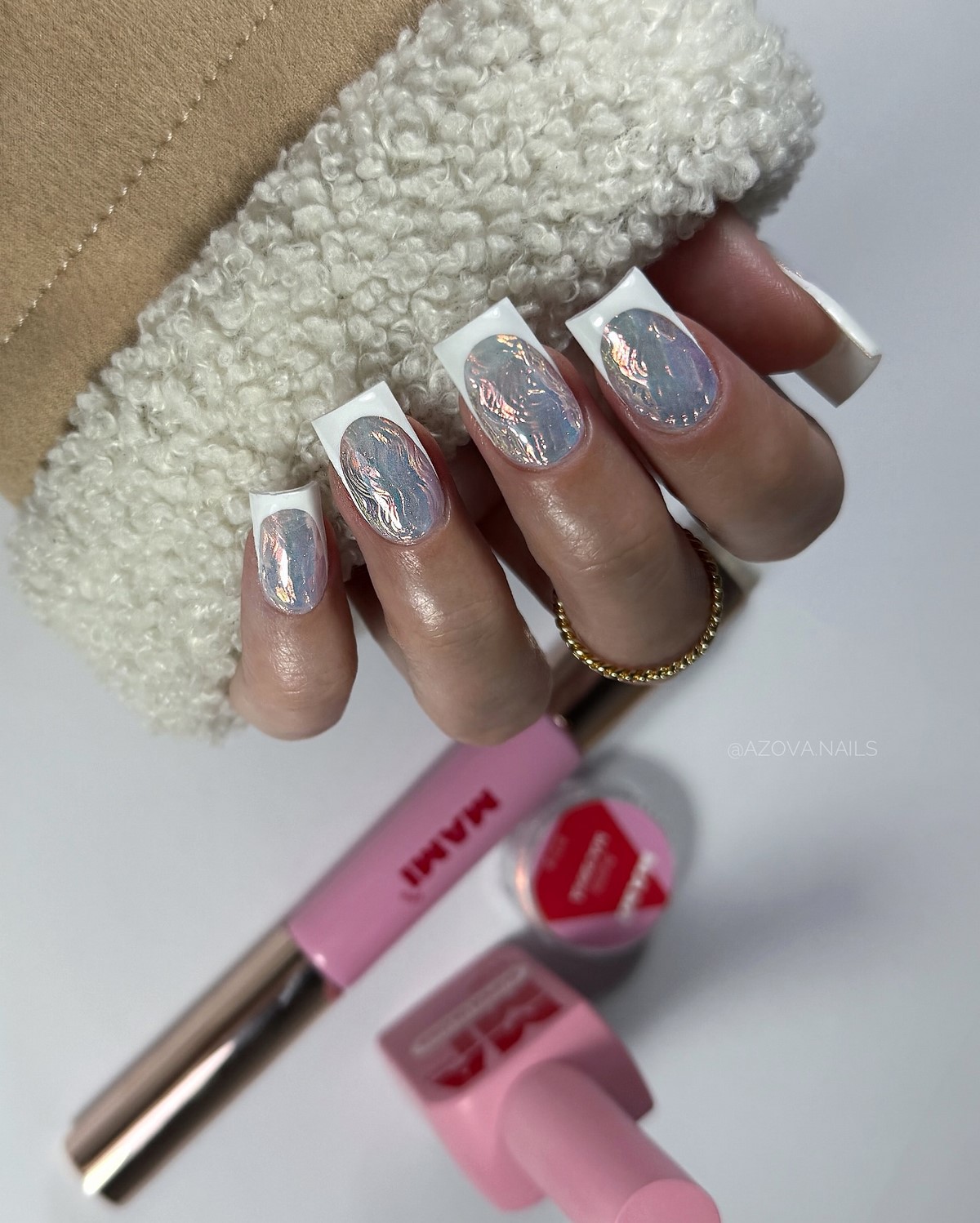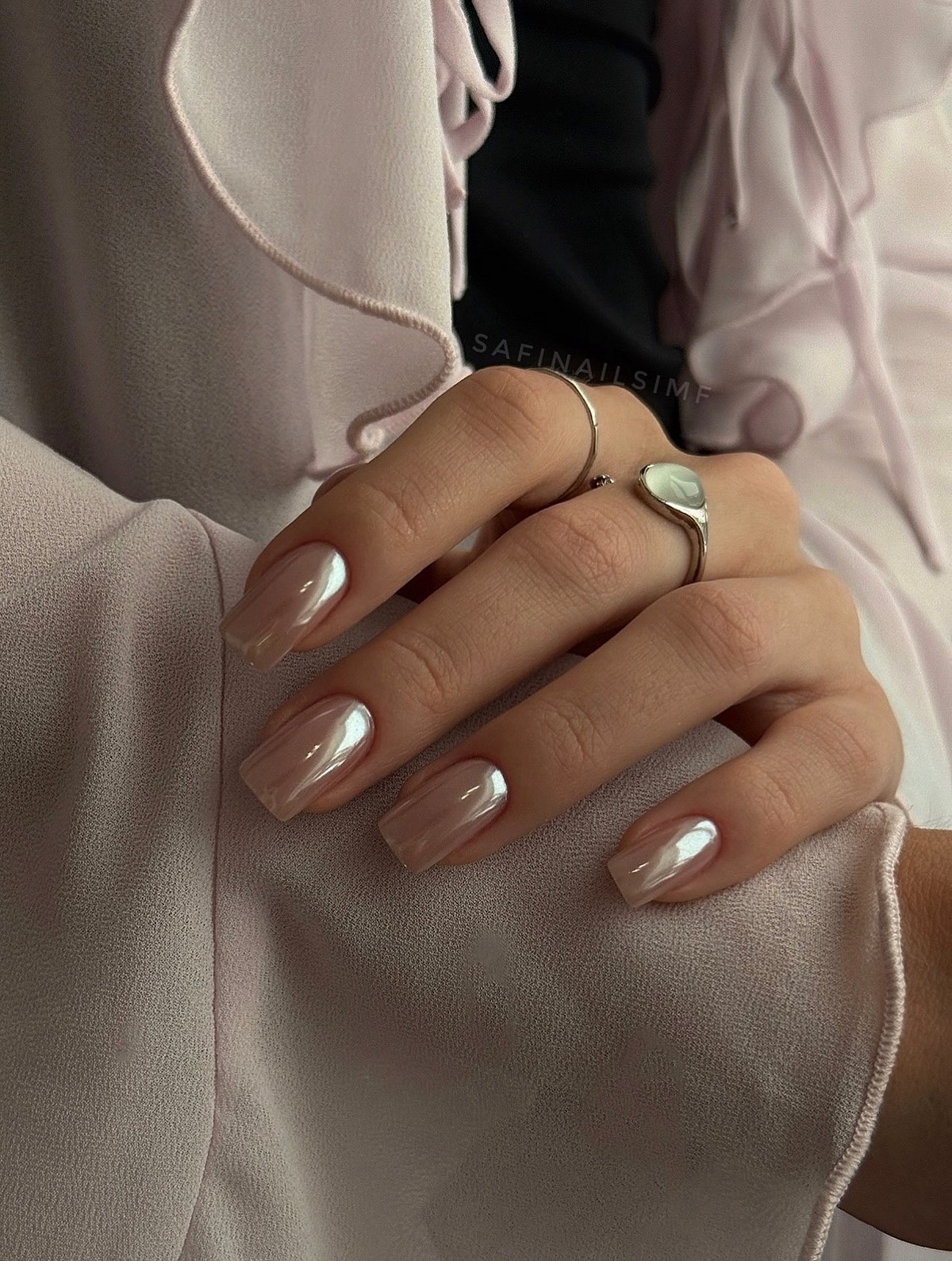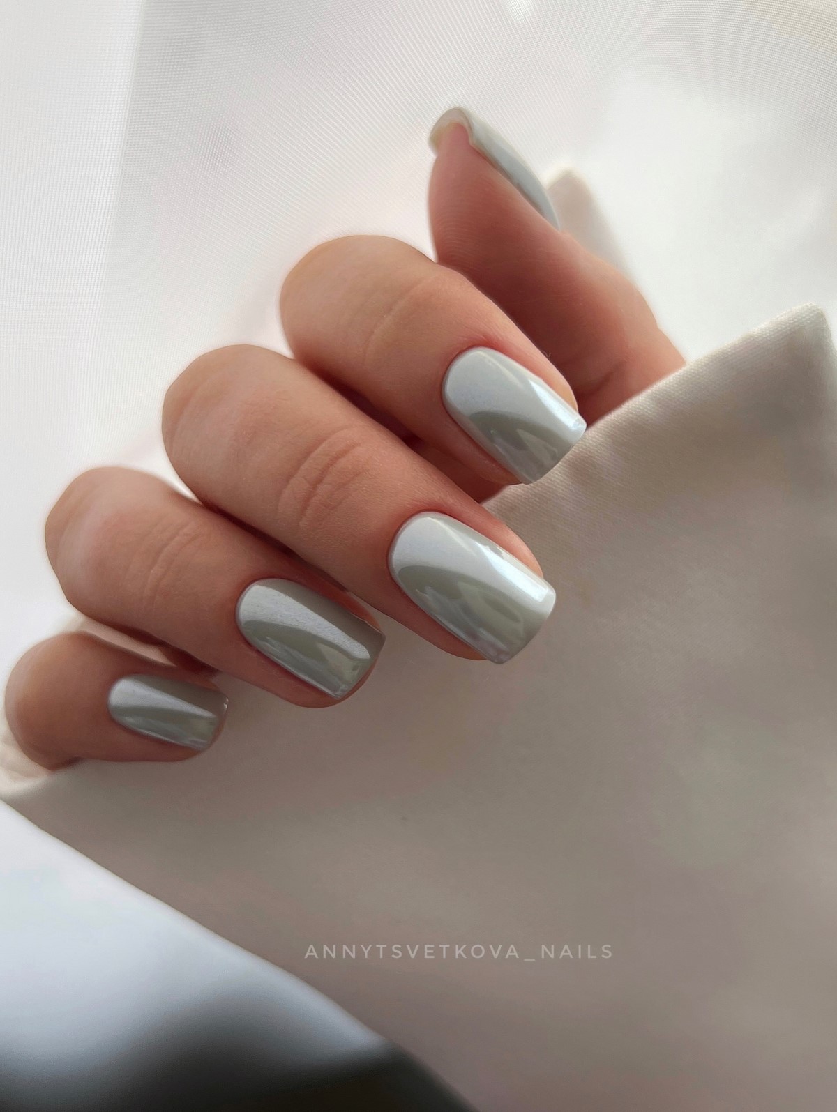 Зеркальная втирка — возвращение к эффектному минимализму. Хром, жемчуг, платина и молочный глянец создают будущее настроение, идеально подходящее к трендам 2026 года. Особенно эффектно смотрится на миндалевидной форме ногтей. Такой дизайн гармонирует и с вечерним платьем, и с повседневным костюмом.