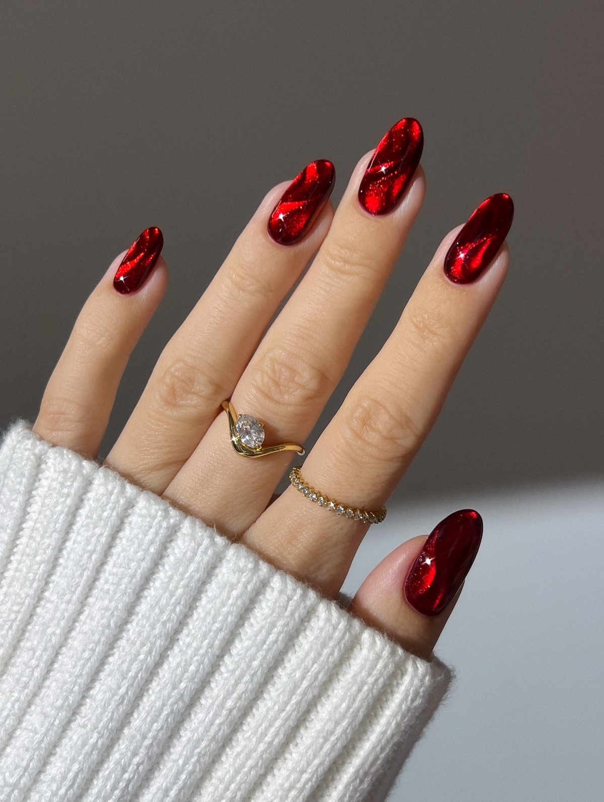 Красный — вечная классика Нового года. В сезоне 2026 он приобретает множество граней: от бордо и вишни до огненно-красного с металлическим финишем. Этот оттенок символизирует страсть, уверенность и праздник. Можно добавить акцент — золотую линию или один ноготь со стразами — для завершённого образа.